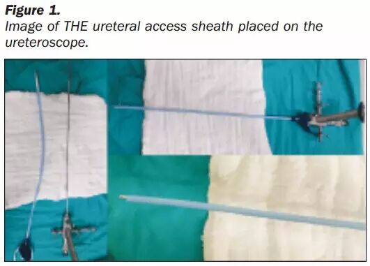 患者一律采用全麻。先用8F半硬镜探查,再上导丝。Sonmez医生喜欢使用10/12F 45cm的鞘。因为半硬镜长度43cm,特地用手术刀把鞘的末端切去3cm,注意不留任何毛刺。这样,半硬镜有1cm露在鞘外。之后连鞘带半硬镜一起在直视下放置。之后的软镜操作同常规。