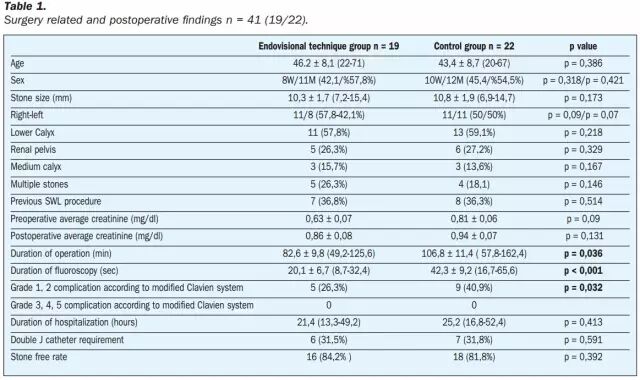 2014年3月到2015年8月期间,为治疗肾结石,共有41名患者接受了软镜手术,其中19名患者采用了内镜可视化技术作为试验组,另外22名未采用可视化技术的患者则作为对照组。多方面多角度对患者进行评估,包括:年龄,性别,肌酐水平术前术后的水平,手术时间,术后及住院时间,结石大小及位置,是否存在多个结石,先前进行冲击波碎石术(SWL)的情况,是否需要置入双J输尿管支架,并发症发生率,残余结石率及结石排空率。