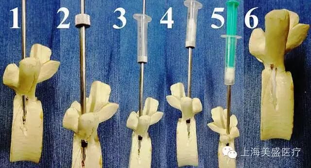 套筒留在原位,拔出斯氏针,在注射器内加入骨水泥(图 2-4),接上注射器推杆,将骨水泥推入椎体内,注射时注意 C 臂机透视是否存在渗漏(图 2-5)。等待 5-8 分钟,待骨水泥完全硬化后,旋转拔出钻头套筒(图 2-6)。完成单侧的骨水泥注射。