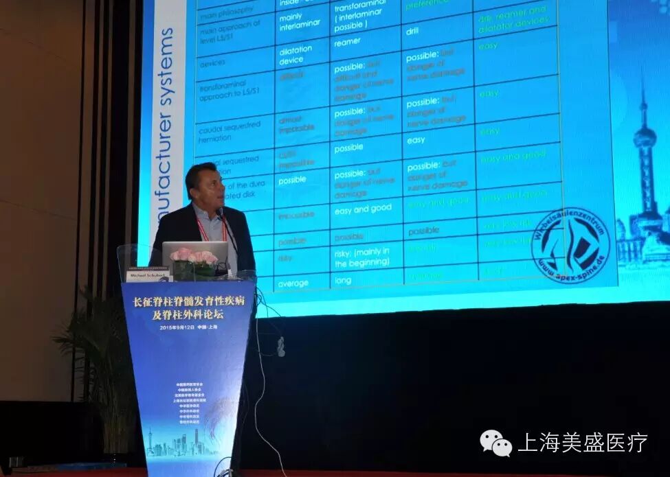 在此会议期间,北美医学教育基金会和上海美盛医疗器械有限公司共同邀请了国际著名脊柱内窥镜微创专家、德国Apex Spine中心负责人Michael Schubert博士做了两场精彩的大会演讲,题目为“有或没有椎间孔狭窄的颈椎间盘切除和减压”和“Ceptovision椎间孔镜手术”,现场反应热烈。